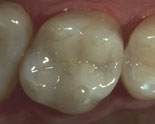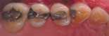 Tennenes tyggeflater sett mot ganen. Dekkende keramiske innlegg erstattet de gamle amalgamfyllingene, samt bygget opp den nedslitte emaljen (se de mer fargesterke områdene på venstre bilde). Totalt seks behandlede tenner i bildet.