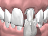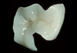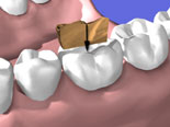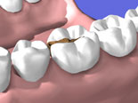 En tann med et hull sett fra siden. Om tannveggene er tynne kan tannlegen lage et dekkende innlegg (høyre bilde) for at skjøten mellom innlegg og tann ikke skal havne på tyggeflaten. På denne måten reduseres slitasjen på skjøten.