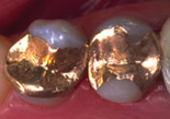 To 20 år gamle gullinnlegg (bildet til venstre). Det venstre innlegget er delvis dekkende. Bildet til høyre viser det keramiske innlegget som ble limt fast i jekselen øverst på siden. Keramer er svært holdbare og fremstilles med høy presisjon.